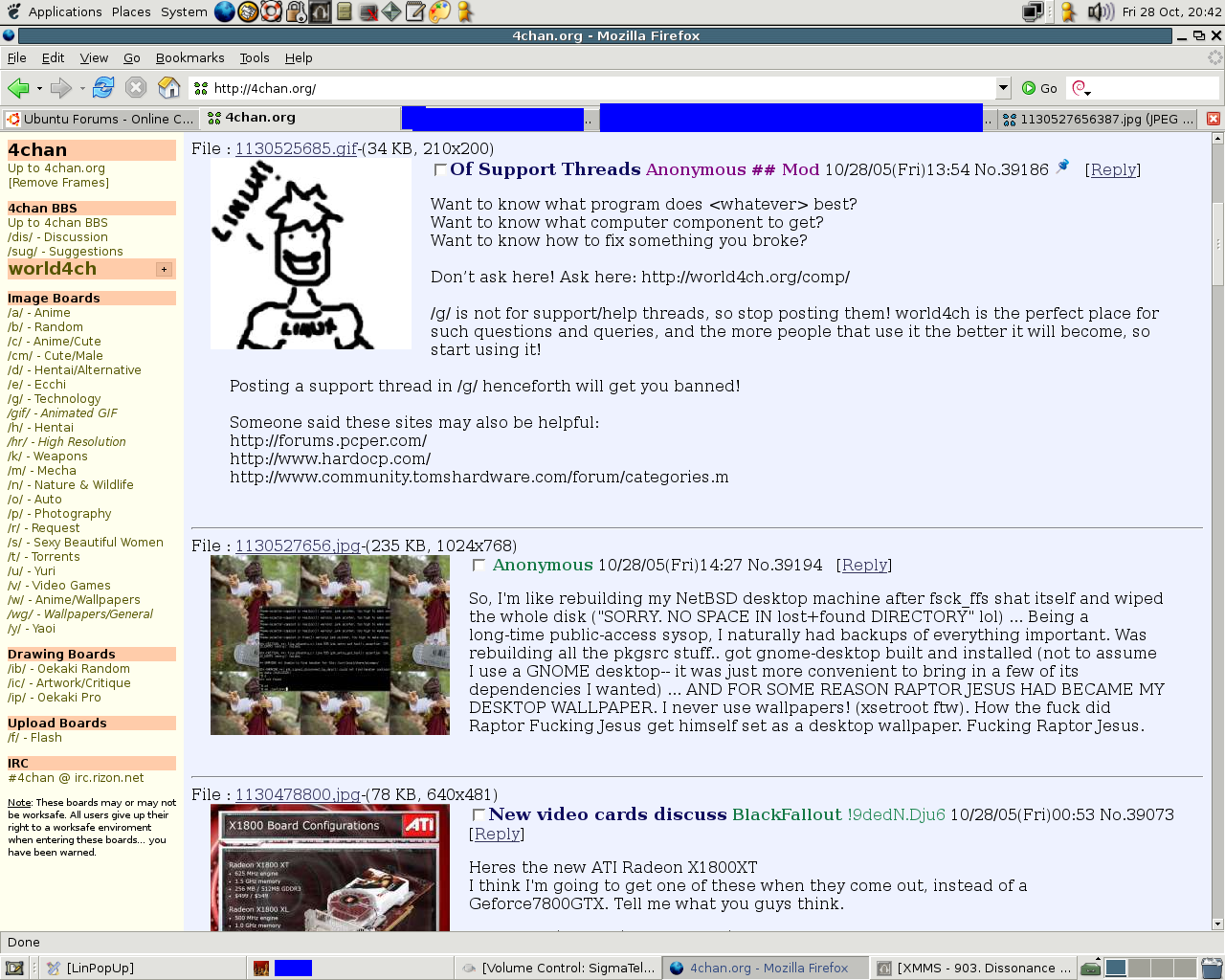 >>108007130>I assume BSD kernels are similar enough this should be possible?This is not Linux. The kernels between all the three main BSDs vary wildly.>>108007790>Actually how does BSD kernels load drivers?https://www.youtube.com/watch?v=W5qhWw07qpUhttps://www.openbsd.org/papers/eurobsdcon2017-device-drivers.pdf>>108007909FreeBSD is only supported because Nvidia supports it and the driver for FreeBSD doesn't even support a lot of the features (e.g. CUDA) but you can get it working (people say on the forum) through the Linux emulator.That's nouveau. We already have nv(4)https://man.openbsd.org/nv.4>>108008496A lot of us use emacs. It's the most lightweight application for viewing epubs, cbzs and pdf files among other things.Stop falling for D&C.