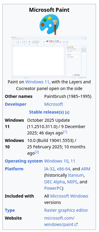 >>108000157No it wasn't. MsPaint was released in 1995. Paintbrush was a completely unrelated codebase. The source code for both have been leaked, they don't have a single line of code in common.