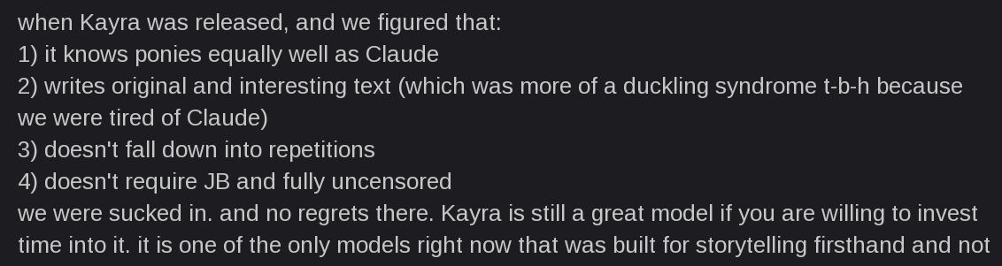 https://desuarchive.org/mlp/thread/40710973/#40712095v>>Kayra's one significant plus is being 100% dependent on user.>The migration from silly was really hard and painful time for me, but holy shit it's amazing how much my own creativity has risen, not to even mention the quality of my written English. My head is full of ideas and prompts like never before.Kayra unironically made me a better person.