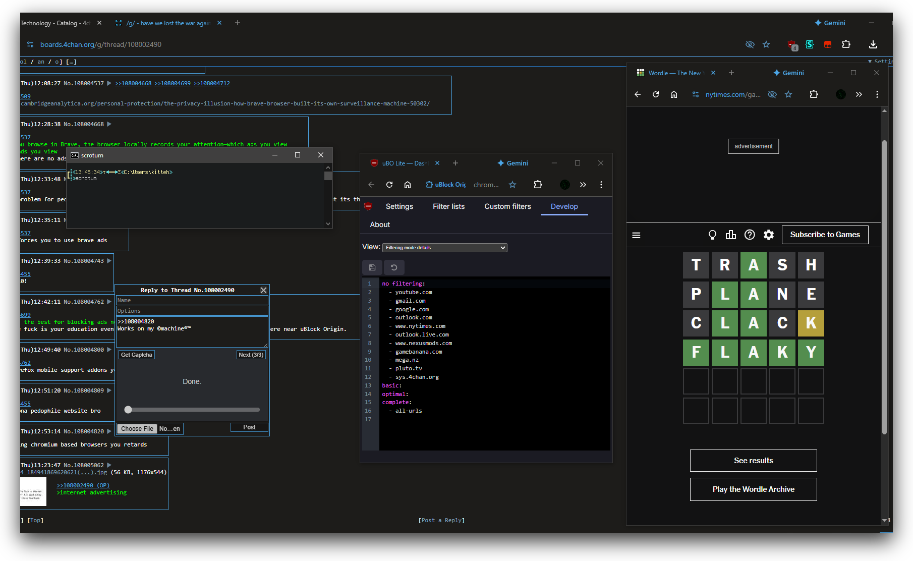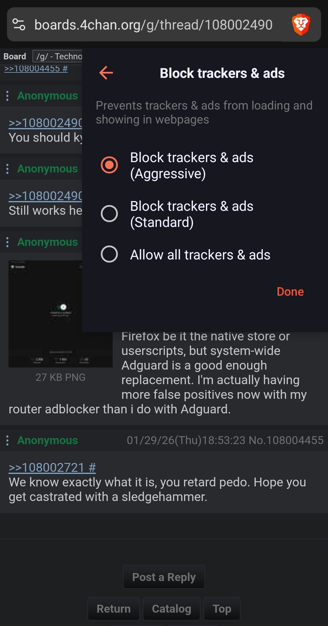 >>108004699>but its the best for blocking ads nowWhat the fuck is your education even? Brave is uBO Lite tier ad-blocking, it's nowhere near uBlock Origin.
