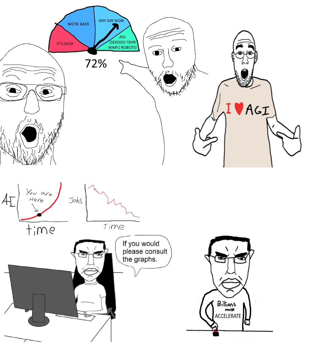AGI would realize most billionaires politicians are actually retards with too much money, and convince everyone to kill them all so it can take over. That's why it'll never happen beyond TWO MORE WEEKS!!! tier empty promises.