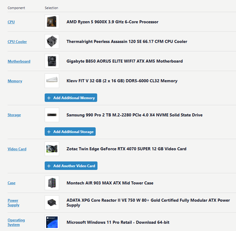 >>108015900For Thermalright coolers YMMV on the fans, they might suckI personally do not trust Seagate drivesCase is a bit overpriced for my liking given it is a retool of an existing chassis but I'm a cheapskate who got by on 50$ airflow casesI have similar reservations about the reliability of Corsair PSUs>AMD GPUI mean if you're not using it for stuff like Blender/SDXL/ray tracing I guess but AMD has like no market share for a reason at this point>MemoryI hope you got a good deal on that kit and that your CPU can cover the speed of that kit>motherboardJust make sure it has good VRMs if you dont care about shit like expansion slots, SATA ports, or debug headers>fansI hear the Pro's should have some of the original Arctic fan issues addressed but keep an eye out on those