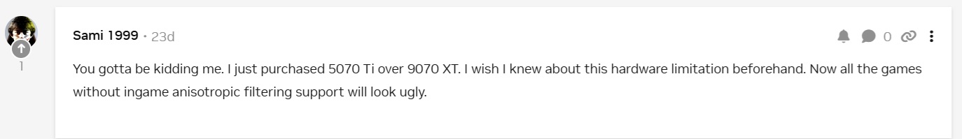 Nvidia 5000 series is no go because they have broken AF in games 10+ months later.https://www.nvidia.com/en-us/geforce/forums/game-ready-drivers/13/562153/anisotropic-filtering-driver-level-creates-solid-r/