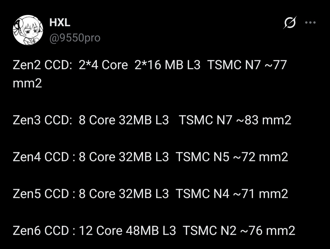 >>108012745Not an interesting leak if it's got nothing to say about the rest of the chip.Enthusiasts are looking forward to Zen 6 because it's rumored to bring the biggest design change since Zen 2.AMD's also not guaranteed to give away fully enabled 12-core chiplets on Ryzen 7 CPUs; Ryzen 7 could be left with 8 & 10 core chiplets, with the fully enabled 12-core chiplets reserved for the Ryzen 9 CPU.