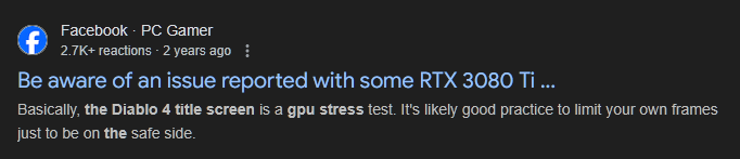 >>108015316Clearly there is an issue because "uncapped menu" is constantly an issue that gains attention every few years when a AAA game melts thousands of graphics cards. You can blame the GPUs, but you don't need a menu running at 2400fps and it's probably putting weird stresses on cards that's completely different from when they're just processing 3d at 100% load.