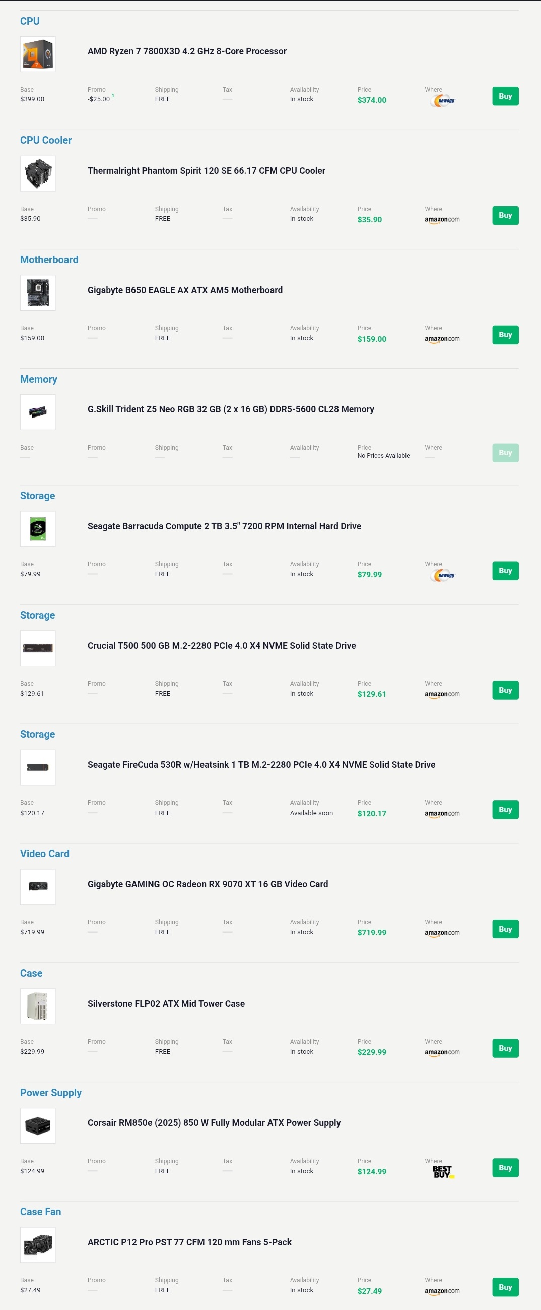>UPGRADE & BUILD ADVICEPost build list or current specs: https://pcpartpicker.com/Provide specific use cases and your BUDGET and COUNTRY>CASEmATX: AP201, Lian Li A3, O11 Air Mini, XT M3, CH260ATX: XT PRO (ULTRA), AIR 903 Base/MAX, Lancool 207, Flux Pro, Meshify 3, 4000D FRAME, X50Dual Chamber: Y60/70, O11 Vision, Antec C8>CPUGaming: 14600K, 7/9600X, 7/9800X3DBudget: 12400, 12600K, 7500FWorkstation: 265K, 285K, 9950X3D*Multiple manufacturers reporting issues on AM5 platforms. Do your research.*On Raptor Lake microcode is mandatory>COOLERAIO: Thermalright Frozen Edge, Lian Li Galahad II Lite, Corsair Nautilus RS, Cooler Master Atmos, Liquid Freezer 3/Pro (Bad mounting solution)ITX/>42mm RAM: Mugen 6 Dual Fan, AXP120-X67TIM: MX-7, MX-4, Duronaut, *PTM 7950, Kryosheet*Most listings online are not actually 7950>RAMDDR5: 2x16GB 6000CL30 (AM5), 6400CL32 (LGA 1700)Workstation: 2x 32GB (budget.), 2x64GB (high-end)>SSD (Keep firmware updated)Budget: SN7100, NM790High-end: SN850X, 990 Pro (Windows)Premium: SN8100https://borecraft.com/>GPUBudget: Arc B580, 9060xt 8GB-Used: 2080, 2080ti*8gb has become a major constraint even at 1080pMidrange: 9070, 5070, 9060xt 16GB-Used: 3080, 3080ti, 4070 (~$380)4k: 9070xtHigh-end: 5090*Exercice caution with 12VHPWR on high end nvidia cards with high power draw.*5070 ti and 5060 ti 16gb production is paused. Don't buy at current insane prices.>PSUBuying guide:https://hwbusters.com/best_picks/best-atxv3-pcie5-ready-psus-picks-hardware-busters/>MONITOR1080p: 24" 165/180hz, KTC H25X71440p: 27" 165/180hz IPS, KTC M27T6 (miniLED), ASUS XG27AQWMG (WOLED but not yet in stores)4K: KTC M27P6 (miniLED)*Pulsar release soon, consider waiting if you've an Nvidia GPU.>OSActivate Windows @ >>>/g/fwt>CASE FANSMeta: Case with good stock PWM fansMidrange: Arctic P12 Pro, P14 Pro (5-pack, loud @ higher RPM)High-end: Fractal Momentum, Noctua G2 (140mm or 120mm)Previous: >>108005927