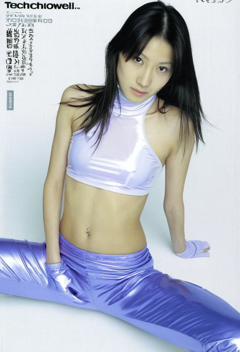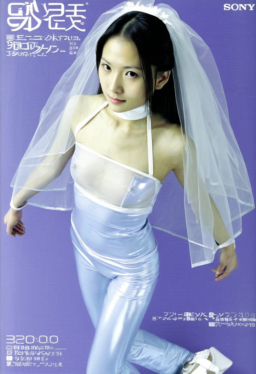 >>108015446Each of them has a bit of a different prompt, but here's the one for my first image:>Positive prompt:commercial advertising photograph, early-2000s Japanese consumer electronics advertising, Sony VAIO / Sony Walkman futurism era, minimalist premium tech aesthetic, restrained sensualityoverhead top-down studio shot, camera directly above subject, centered composition, medium distance framing, head to upper thighs visiblecute Japanese bride, young adult, soft early-2000s pop-advertising femininity, petite slim frame, narrow shoulders, understated curveslying flat on her back in an infinite seamless studio void, body precisely aligned, arms straight at sides, fingers gently curled, one knee subtly relaxed outwarddirect eye contact into camera, calm neutral expression, emotionally reserved, quietly intimatelong straight dark hair neatly arranged beneath head,thin translucent white tulle bridal veil attached at crown of head,low-profile veil layered over hair,veil fabric faintly visible beneath head and shoulders,soft veil edges catching overhead studio light,minimal early-2000s Japanese makeup, realistic skin texturewearing a sheer white halterneck cropped top, translucent synthetic mesh, satin sheen, tight fit, early-2000s techwear stylingwearing ultra-low-rise metallic lavender-blue PVC leggings, smooth elastic sheen, skin-tight fit, early-2000s silhouettesimple white-gold wedding ring on left handinfinite seamless void background, cool silver-to-cyan gradient, no edges, no horizonbarely perceptible matte surface implied only by soft contact shadows beneath bodycontrolled premium studio lighting, cool neutral temperature, overhead directional key light, subtle side fill from one direction, faint rim light on collarbones and waist, restrained specular highlightsearly digital photography realism, slight film grain, sharp focus, Sony commercial finish