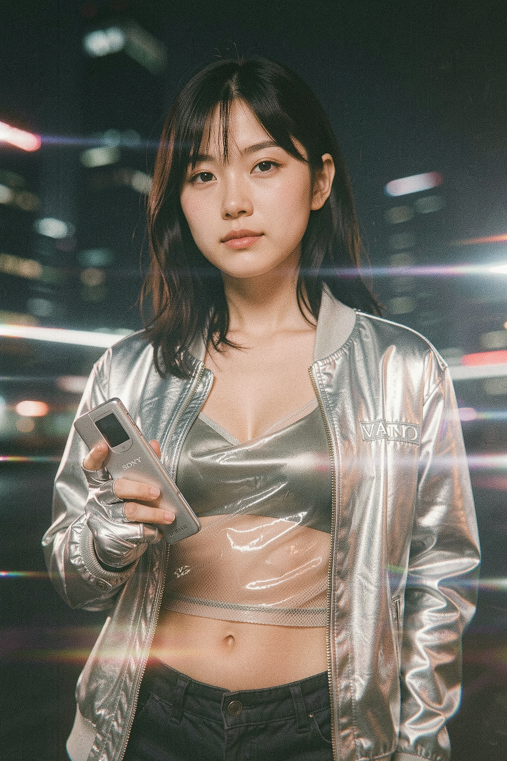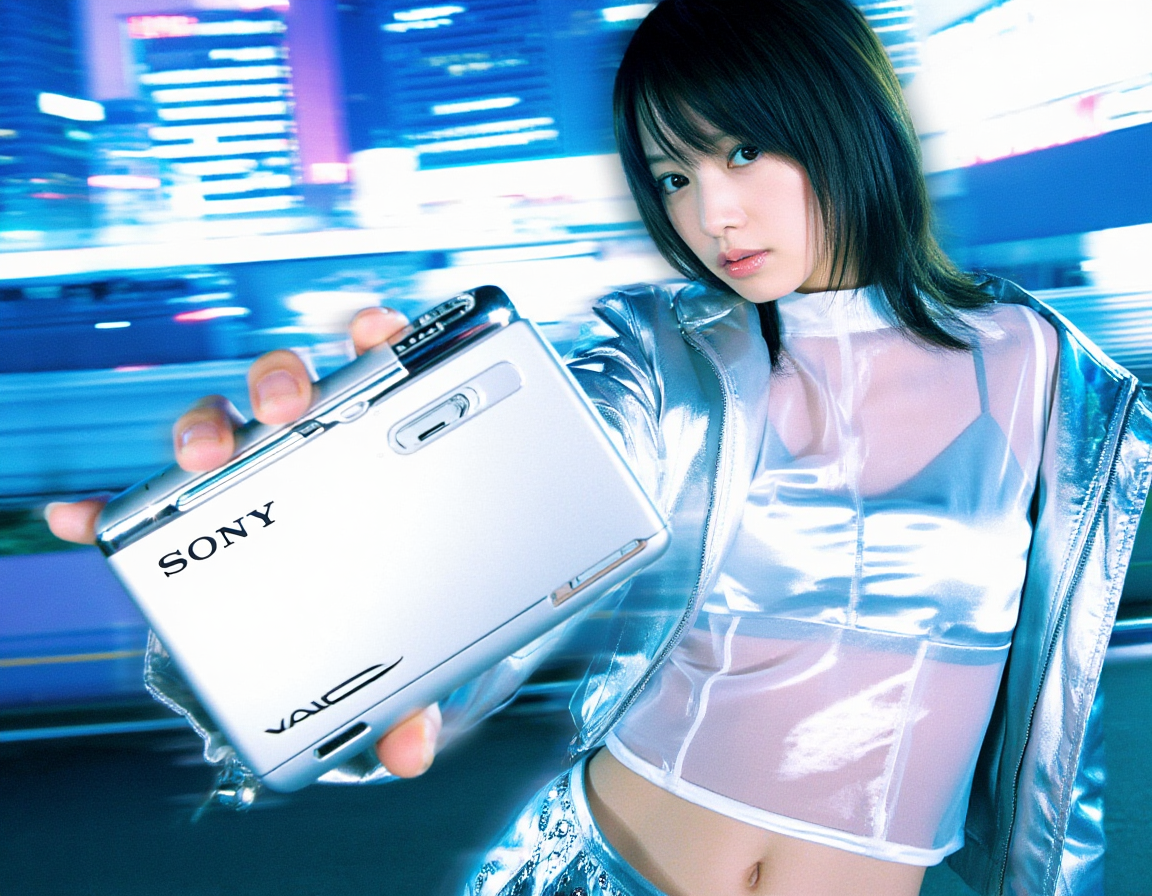 >>108015564Thanks anon. Here's mine, adapted for Z-based >This is a commercial advertising photograph of the early-2000s for a Japanese consumer electronics advertising, Sony VAIO / Sony Walkman, styled as futurism era with minimalist premium tech aesthetic. The photo features a young japanese woman wearing a metallic silver jacket over a sheer PVC crop top of a translucent synthetic mesh with satin sheen, tight fit, in the early-2000s techwear style. She is holding a silver-chrome Sony VAIO gadget, which features in prominent focus in the advertisement. The background is an out-of-focus night city in a metropolitan area, with lights hinting at tall high-rise buildings. A heavy motion-blur keeps the focus solely on the subject, and adds dynamism to the scene. The composition features heavy use of digital post-processing, including bloom, added film grain, and bright horizontal streaks of lens flare.Love this style.TAKE ME BAACK.