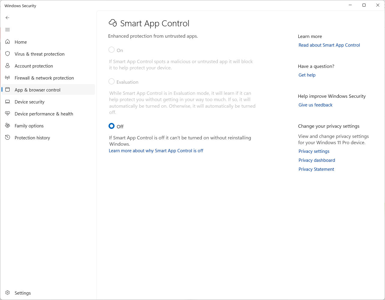 >>108016301If you install 25H2 with Rufus from a clean ISO Smart App Control is turned on by default. Once you turn it off it can’t be turned back on. Obviously just turn it off. You’ll be fine.