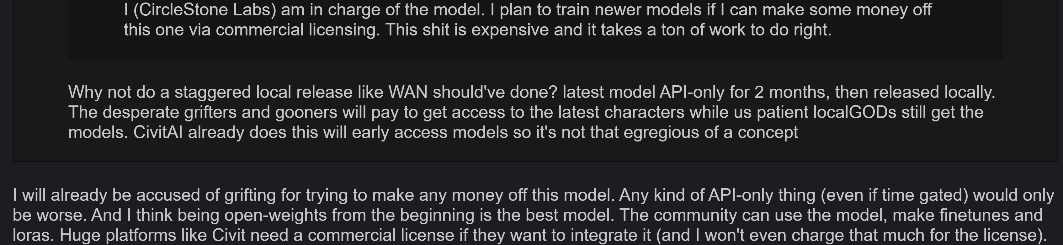 >>108030791I don’t like the idea of a model being sponsored by an API supporter UI dev. Also, if Circlestone already stated the future of their license and the file is called preview.safetensors, that’s a huge red flag.