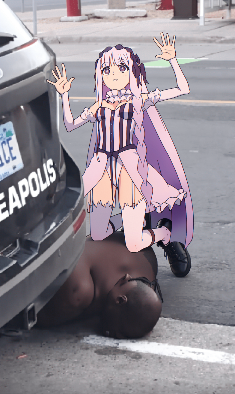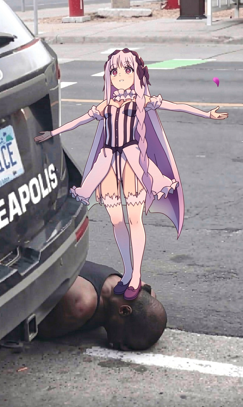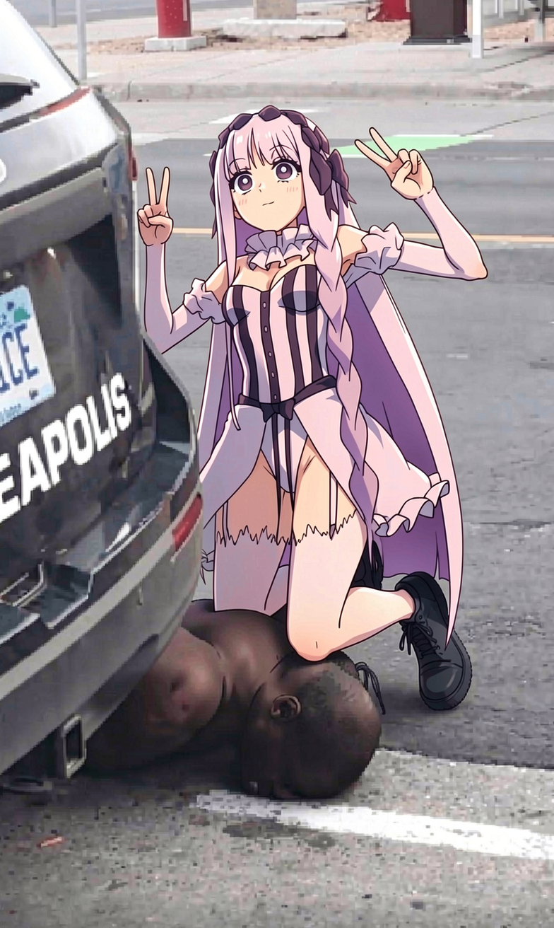 wife!remove the police officer wearing blue. the anime girl in image2 is kneeling on the black man in image1 using the same pose as the man wearing blue in image1. keep her expression the same. her hands are on her thighs.8 steps for distill q8 seems ideal, it's already very fast. 18 seconds for 8 steps.