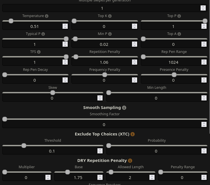 >>108037342>>108037364Appreciate the input but I don't really have that much RAM (32GB) because these were pulled from my old system so mostly sticking to exl for now. I could try Air or 4.6V, are there any settings for them (see pic rel)? I don't have to much experience with them and the writing feels a little dry.