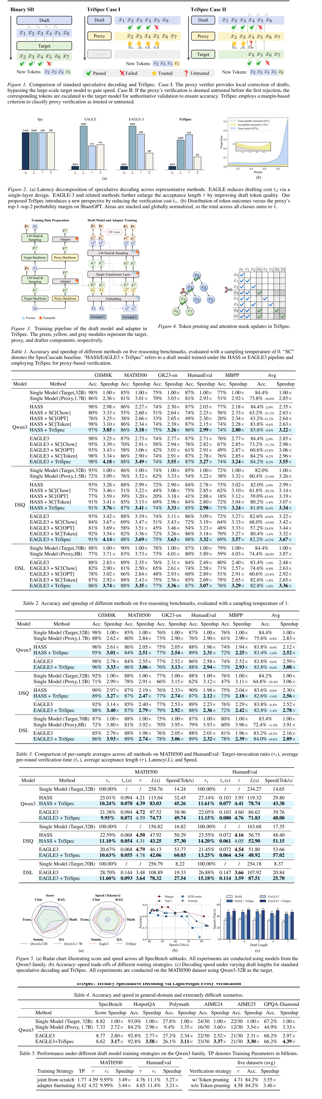 TriSpec: Ternary Speculative Decoding via Lightweight Proxy Verificationhttps://arxiv.org/abs/2601.23180>Inference efficiency in Large Language Models (LLMs) is fundamentally limited by their serial, autoregressive generation, especially as reasoning becomes a key capability and response sequences grow longer. Speculative decoding (SD) offers a powerful solution, providing significant speed-ups through its lightweight drafting and parallel verification mechanism. While existing work has nearly saturated improvements in draft effectiveness and efficiency, this paper advances SD from a new yet critical perspective: the verification cost. We propose TriSpec, a novel ternary SD framework that, at its core, introduces a lightweight proxy to significantly reduce computational cost by approving easily verifiable draft sequences and engaging the full target model only when encountering uncertain tokens. TriSpec can be integrated with state-of-the-art SD methods like EAGLE-3 to further reduce verification costs, achieving greater acceleration. Extensive experiments on the Qwen3 and DeepSeek-R1-Distill-Qwen/LLaMA families show that TriSpec achieves up to 35\% speedup over standard SD, with up to 50\% fewer target model invocations while maintaining comparable accuracy.neat