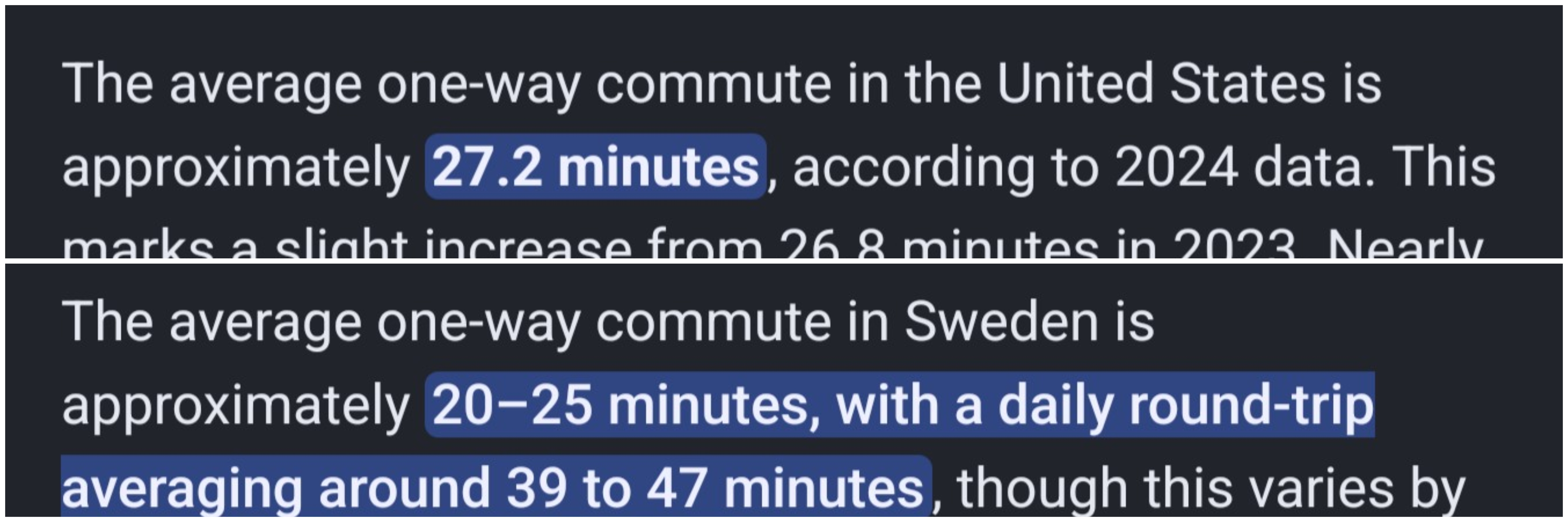 The average commuting distance in sweden is about the same as in the States.