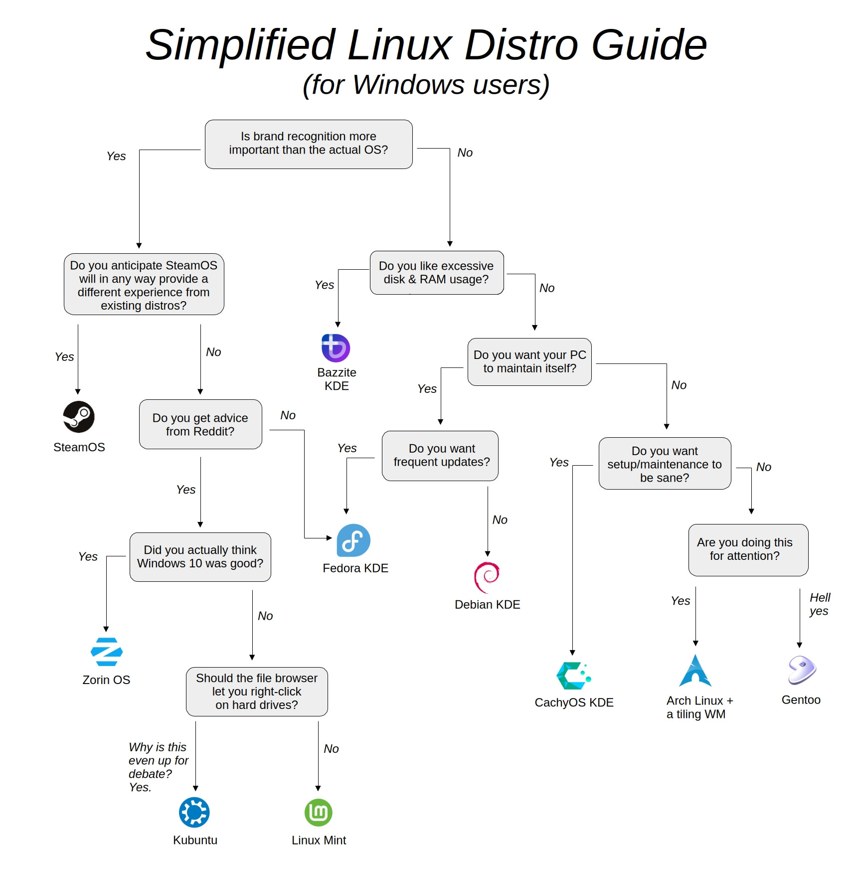 >>108058174every flowchart is gonna be opinionated, and this is really not a good one. bazzite for example has turned bad with the ongoing drama and you'd best steer clear for a while.