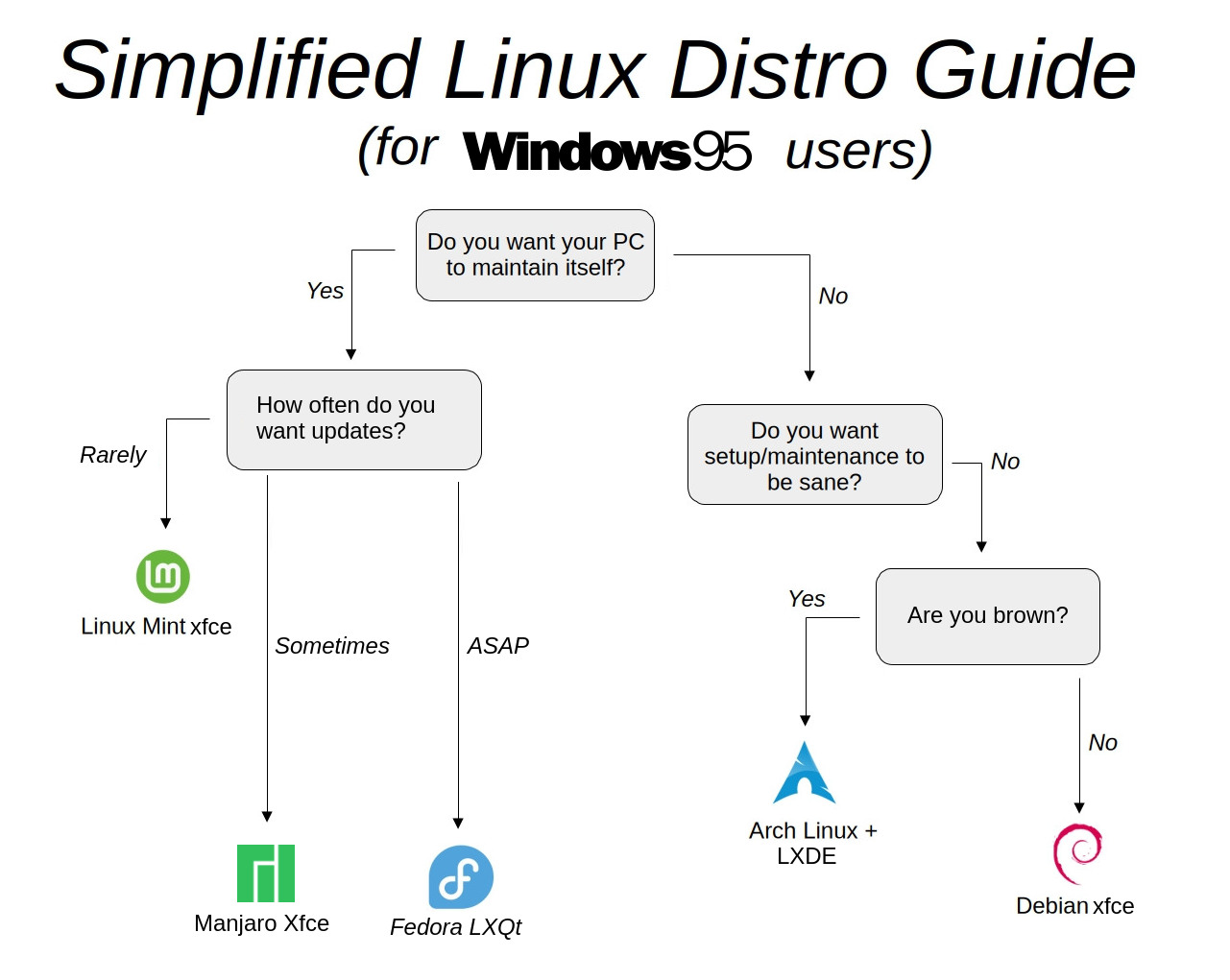 >>108057751>bias toward what "most people want" is still a biasIt's an insignificant bias. I assume that the flowchart was made to be shown to someone looking to start using Linux because they no longer want to deal with Microsoft's bullshit. So a bias in favor of the majority is much better and more helpful than an unbiased flowchart.If anything Gentoo even existing there as a choice is a bias and dumb as fuck. There's 10 choices there while Gentoo isn't even in the top 50 used distros, probably not even in the top 100. It's elevating those 0.01% of Linux users as if they're statistically irrelevant.