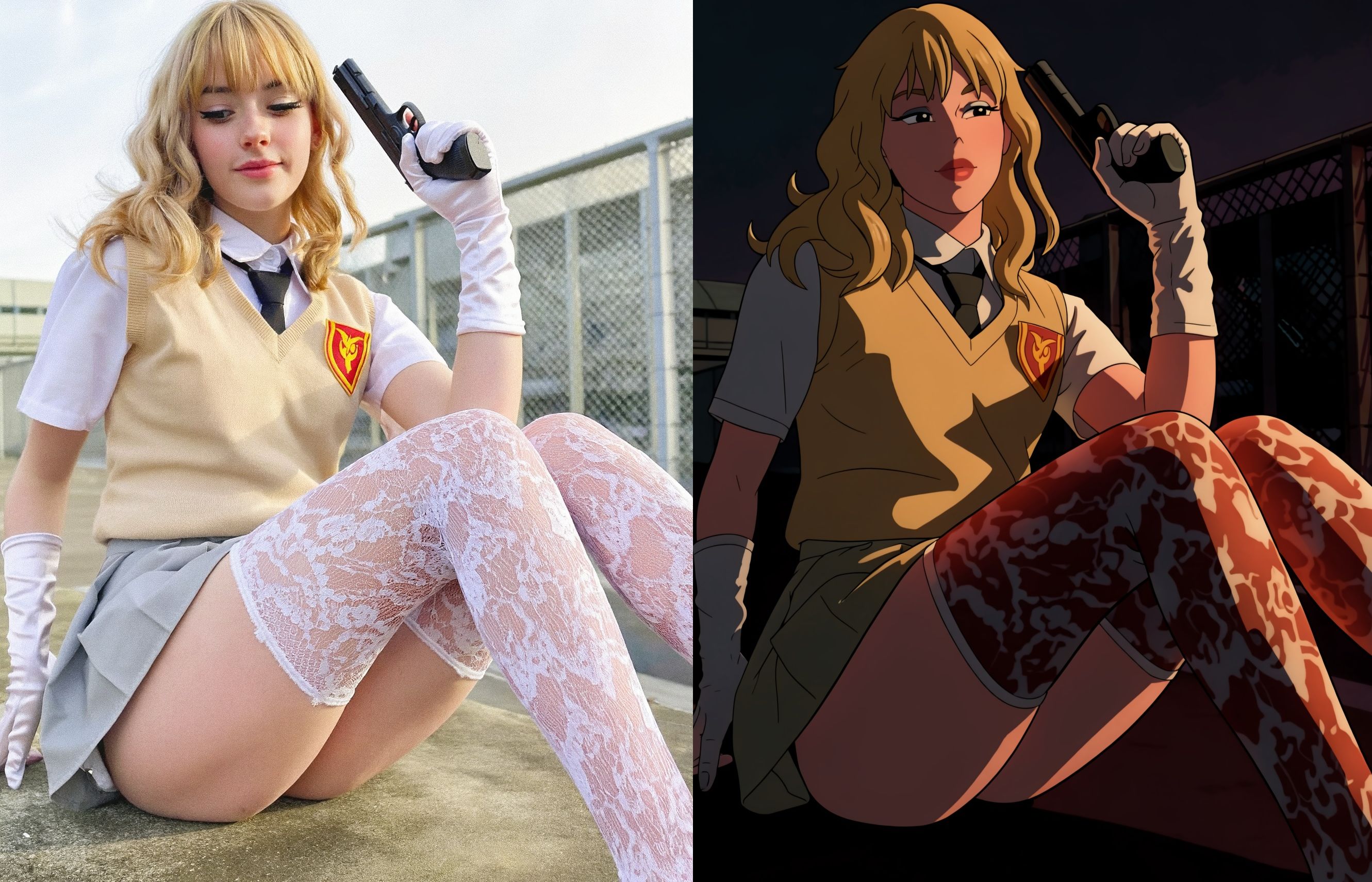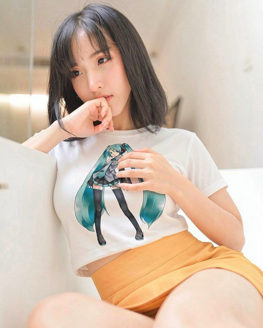 the asian girl in image1 is wearing a white tshirt with the anime girl in image2 on it. her midriff is visible.