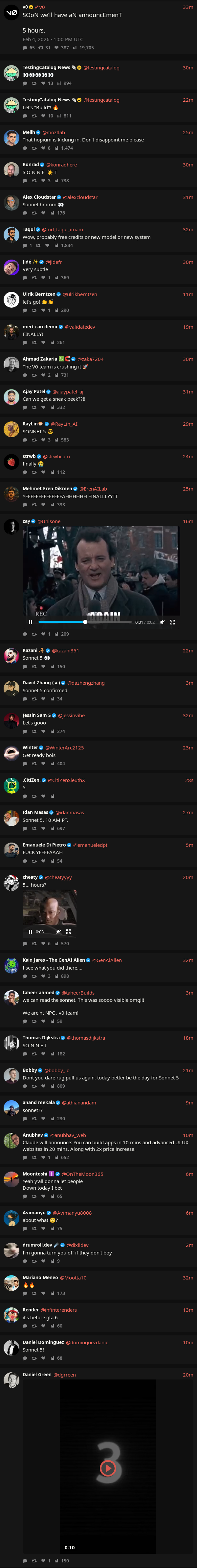 >>108053256Why did people think Sonnet 5 was coming out today again? I've not been keeping up on the /aicg/ lore and idk if it was just gaslighting or if it's real and just gonna come out at like 23:59 or something