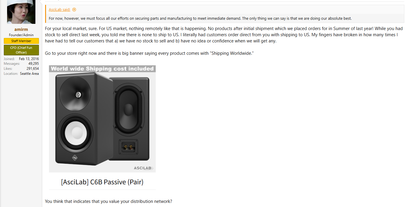 >>108055758QRD for anyone not really in the loop:>After Bill Gates fired him, Amir opened his own home theatre business where he received expensive Harman speakers in exchange for promoting Harman curve studies and shilling>at some point he was cut off as Harman no longer needed the promo>a little bit after this, ASR was suddenly reconfigured to shill high-SINAD gear all from Shenzhen, people have suspected he reached a similar deal with them hence all the pro-TOPPING posts despite their atrocious QC and CS.>Jump to 2025, Amir reveals that he and his brother have locked down all distro rights on these Korean AsciLab speakers, start promoting them as the next perfect piece of gear>still barely sell anything because people have worked out Amir's grift by now>Koreans clearly want out of a bad deal and are just going to indefinitely stall Amir out while selling to other retailers who are moving 5-10x the product.