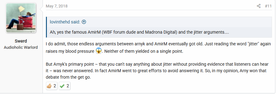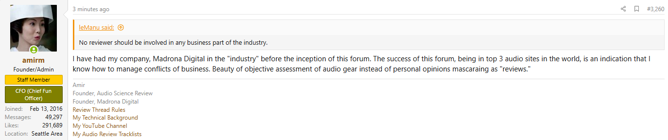 >>108065003>What is Best Forum (where Amir is a moderator)Amir was a moderator of WBF? How? WBF is *the* forum for audiophiles who actually believe in snake oil products working. Man, maybe his bullshit-peddling just simply shifted over the years