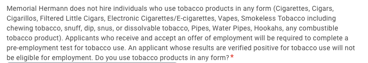 >>108060978i used to work at a medical center and at any given time of day there were at least 15 people out smoking in the parking garage. idk how a hospital could possibly find enough orderlies and nurses to hire if they drug test for nicotine