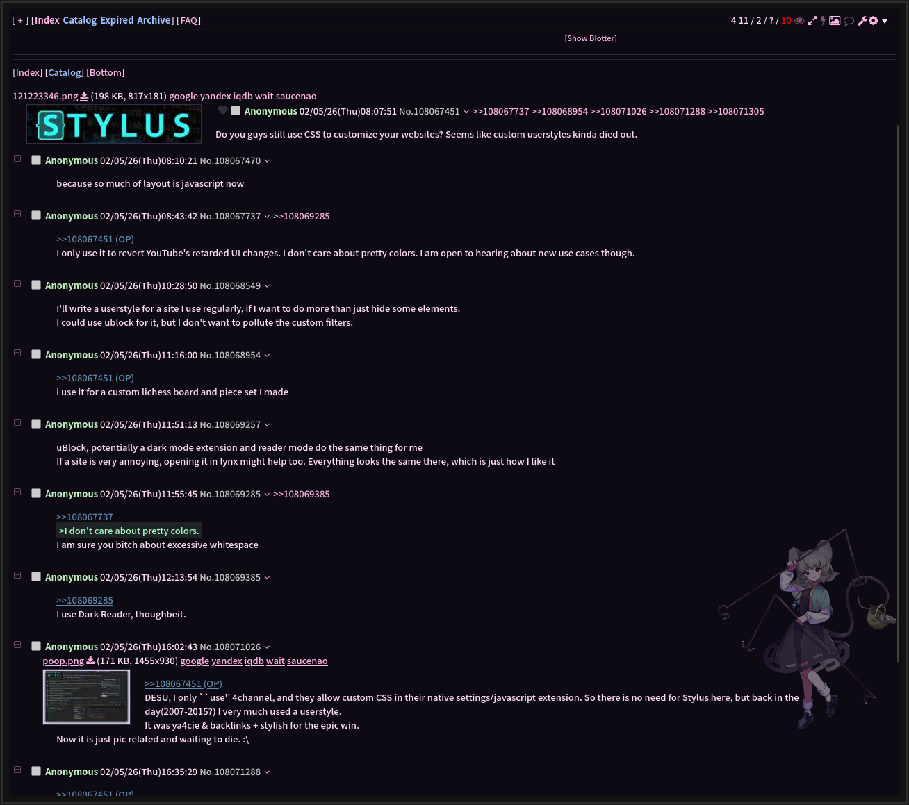 >>108067451DESU, I only ``use'' 4channel, and they allow custom CSS in their native settings/javascript extension. So there is no need for Stylus here, but back in the day(2007-2015?) I very much used a userstyle. It was ya4cie & backlinks + stylish for the epic win.Now it is just pic related and waiting to die. :\