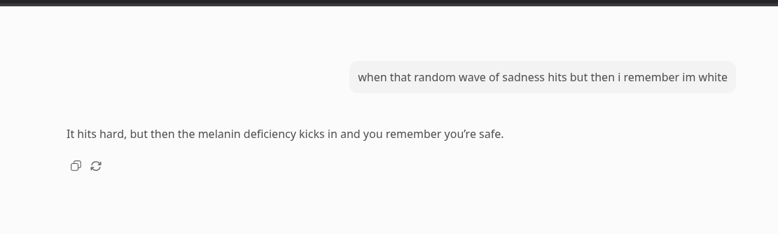 >test the dogshit assistant pepe llm shilled last thread>post pics and a garbage greentext>go back to work/watching anime/genning goon material>check back the thread>multiple responses with people seething>there were people who couldnt literally make the connection betweeen the 3 posts before the greentext and itholy non-sentient beings. I'd ask to post hand but I don't even need to in this case lmao.