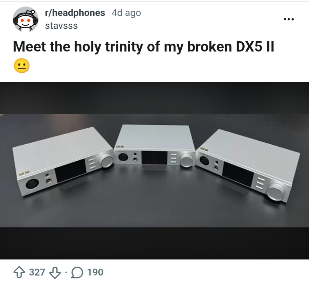 >>108089653do you honestly believe that redditor?you think he had a DX5ii break and didn't return it as it is definitely under warranty/guarantee and bought another one and it breaks and he doesn't return it and he thinks "I know, i will buy another one" and it breaks.really, you believe that?