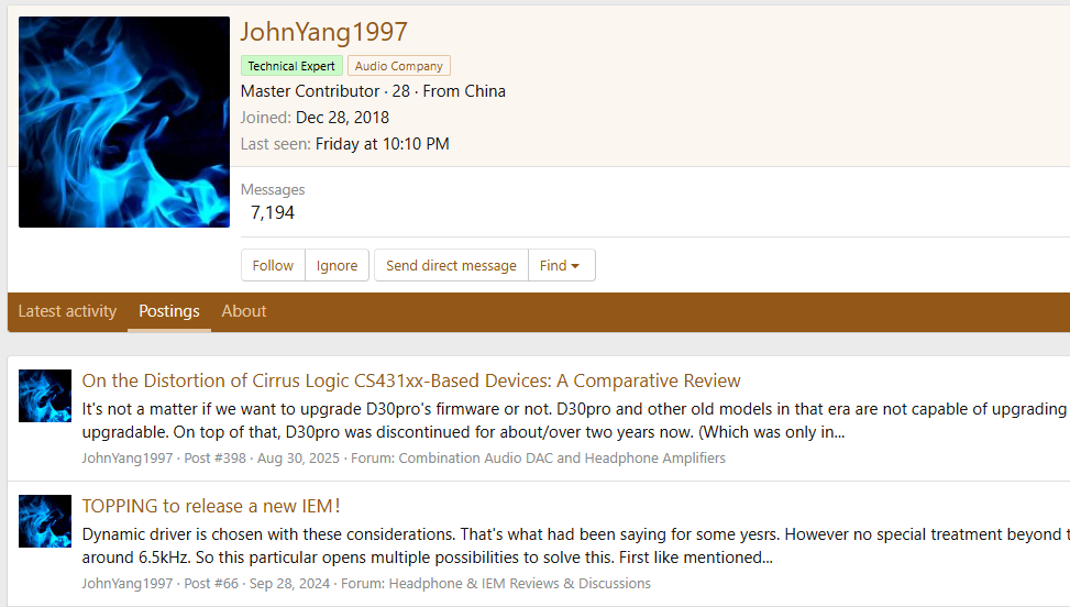 >>108089653funny to see John Yang go MIA after all his amps started to explode and his IEMs got a really middling response before being priced out by Crinacle (who hates his guts)dude used to spend all day every day on ASR defaming other brands until he got forced to reveal he designed the L30 after they started wiping out half of ASR's net worth