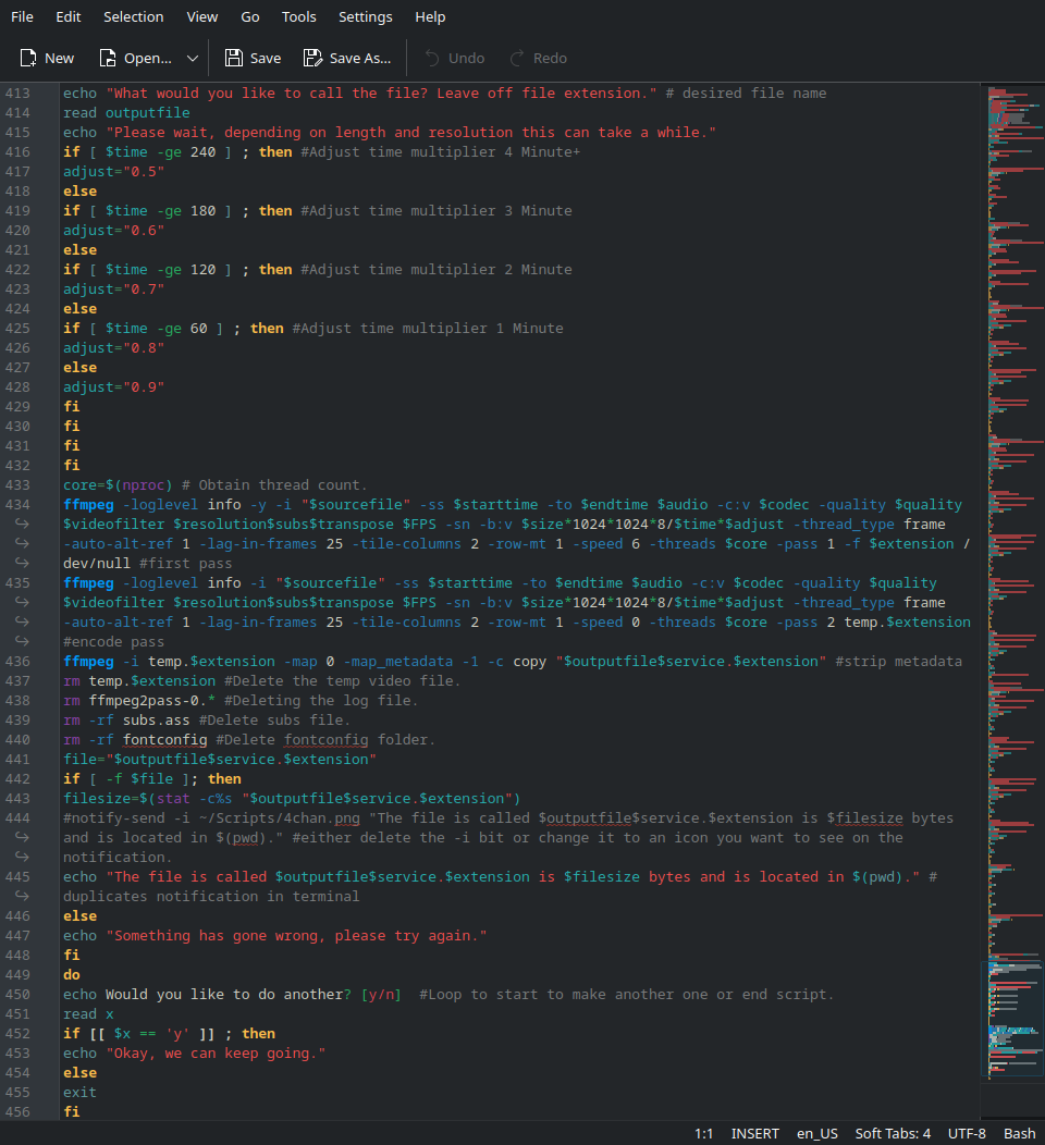 >>108108653>ffmpeg commands are really fucking hard and complicatedTell me about it, I wrote this script when 4chan first supported webms and have updated it every time a new feature was added. It aims to always come in just under the file size limit. It's not always successful though since ffmpeg takes the file size as a suggestion.