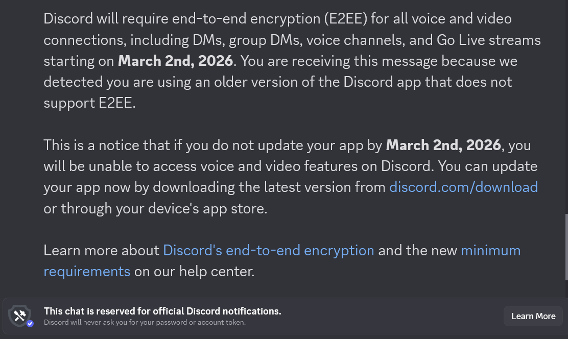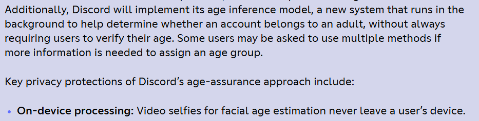 >>108101006Direct messages and servers that are not age-restricted will continue to function normally, but users won’t be able to send messages or view content in an age-restricted server until they complete the age check process, even if it’s a server they were part of before age verification rolled out. Savannah Badalich, Discord’s global head of product policy, said in an interview with The Verge that those servers will be “obfuscated” with a black screen until the user verifies they’re an adult. Users also won’t be able to join any new age-restricted servers without verifying their age.People should read, as long as you're not joining age verified servers you don't have to prove anything.