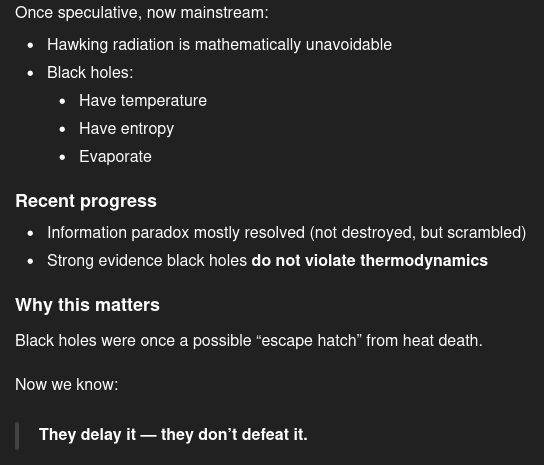 >>108104215>black holes suck everything up, including light >black holes would be the last objects in the universe after everything else dies and decays to atoms (entropy)>hawking found out due to timey wimey shenanigans a tiny amount of radiation actually escapes them>it will take trillions of years, but eventually even black holes will evaporate thanks to that tiny amount of radiation escaping>in trillions upon trillions of years nothing will exist in the universe except atoms who will be galactic distances apart and will n0ot be able to interact>no matter, no energy, no interaction or reaction = heat death = eternally cold and unchanging empty universe