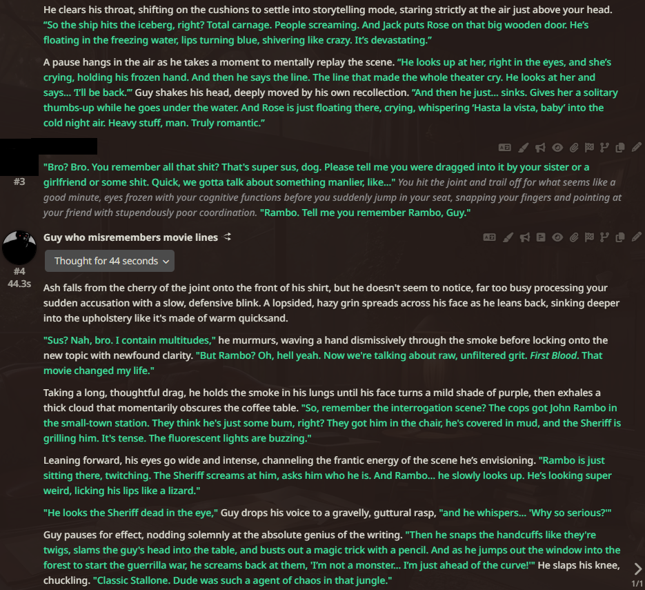 >>108112238>>108112245I have to wonder about intermingling perspectives,(user 1st/bot 3rd | user 3rd/bot 2nd) and so onIs this confusing for models, or are they usually stable about mixed perspectives?