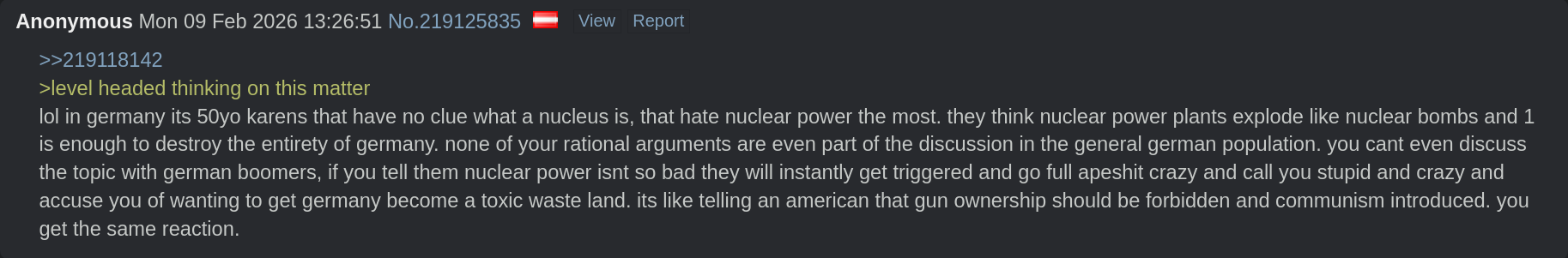 >>108118304>russiaans fucked up>therefore>NUCLEAR IS SOMEHOW EVILbrainfucked.Next you're gonna tell me some bull about human caused glibal warming and CO2 neutrality...Take your fucking pills and go back to plebbit.