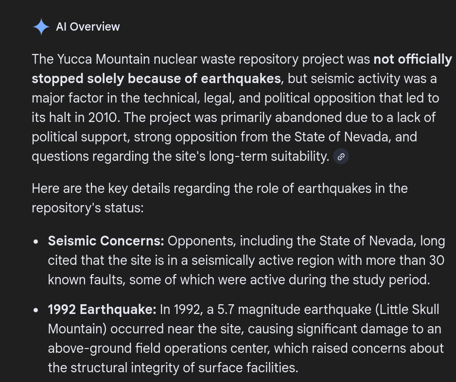>>108118692Nuclearfags in general are incompetent. They wanted to bury he waste in a fucking mountain. Guess what mountains are highly correlated with? EARTHQUAKES. They wanted to put their waste in a fucking earthquake prone area. They had to scrap the fucking thing when the earthquakes started. At least the Finland proposal is in a seismically stable region, but just goes to show these nuclearfags are winging it with starry eyed ideals.