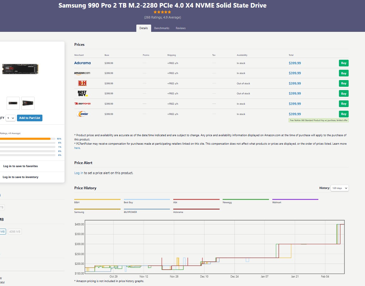 >>108132282I built a fully new pc in mid January using micro center bundles, discounts, price matching, and price protection to squeeze out as much price to performance as I could with the parts I was choosing. Looking at historical prices I was only a combined $200 over the all time lows for the 32gb ddr5 ram kit and 2tb gen5 SSD I ended up with (GPU was msrp). The only real concession, however, was that the ram was part of a bundle, so there was no way I was going to be able to get 64 gb like I wanted and stay within my budget. But I probably didn’t need it in the end anyway. Prices have gone up since then, of course.