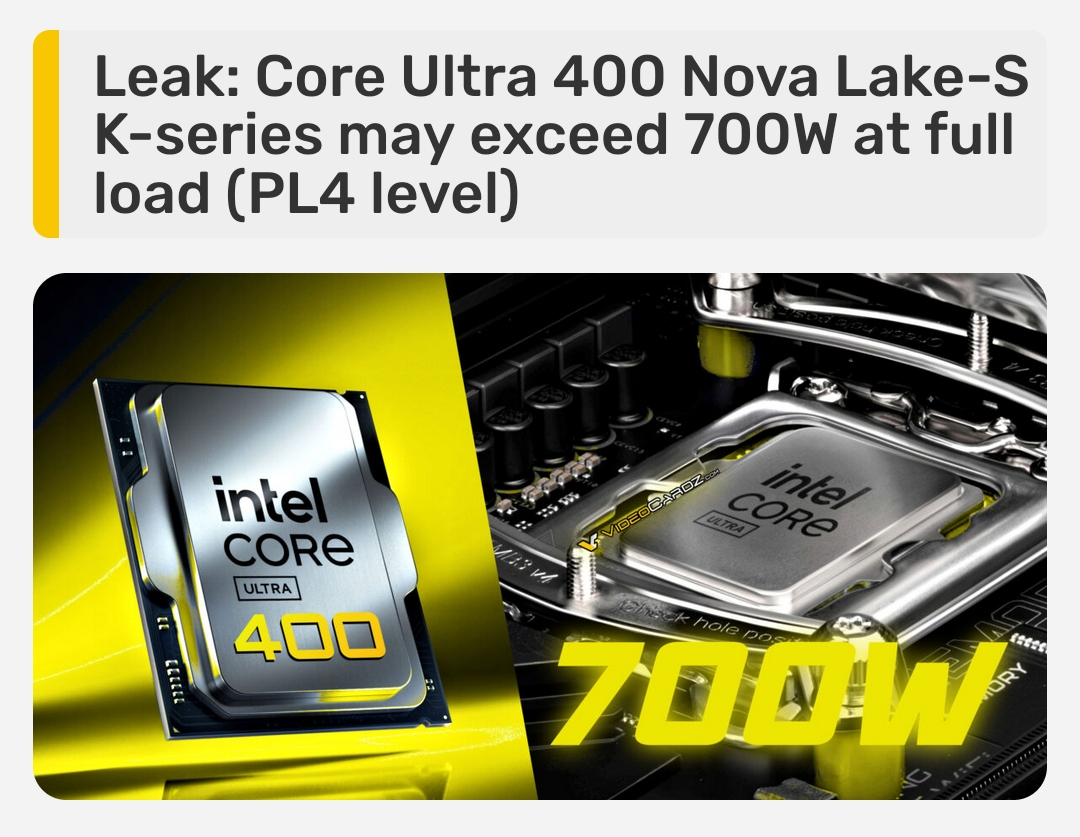 >>108135815It's just the official power cap in case when board partners set “unlimited” power limit mode.>As a hard limit, PL4 isn't something you'd normally encounter, rather serving as a hard power limit in order to protect the processor when you remove power limits in your BIOS (such as when using the Intel Extreme performance profile). The chip will thermal throttle before it gets anywhere near 700W power draw in a custom liquid cooled daily setup.>another leaker, Jaykhin, says that Nova Lake won't allow you to offset TJMax, the maximum safe operating temperature, so you manually force the CPU into running hotter