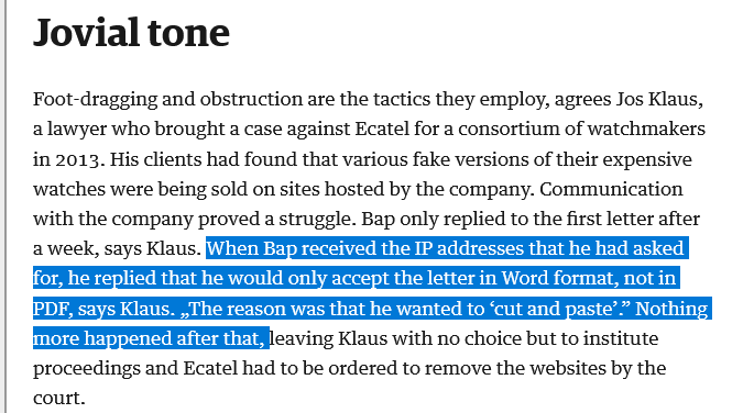 The public RIPE mailing lists are a fucking goldmine for this by the way. They didn't have enough IPv4 addresses so they stole them from Africa (kek):>https://www.ripe.net/ripe/mail/archives/anti-abuse-wg/2020-January/005596.htmlThe same names pop up all the time everywhere:>Ferdinand Reinier van Eeden (ex-Ecatel, now IP Volume and Novogara)>Bartholomeus Johannes Karreman (REBA, a shell company)>https://archive.ph/H9Elx (long-read about this shit)>A former employee of competitor LeaseWeb: „We would then see them resurfacing on Ecatel.”Pure entertainment.