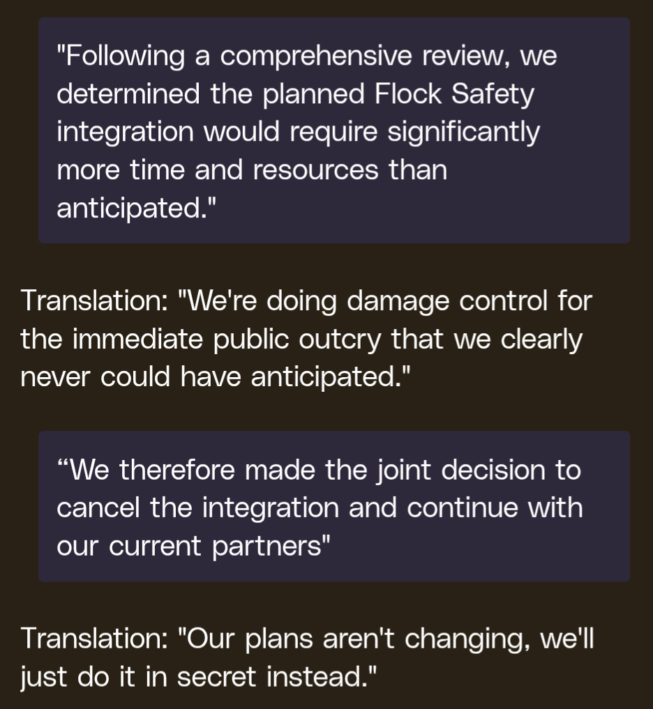 > we determined the planned Flock Safety integration would require significantly more time and resources than anticipated. We therefore made the joint decision to cancel the integrationtranslation: you cant just have cameras hand over footage of thieves, it's racist