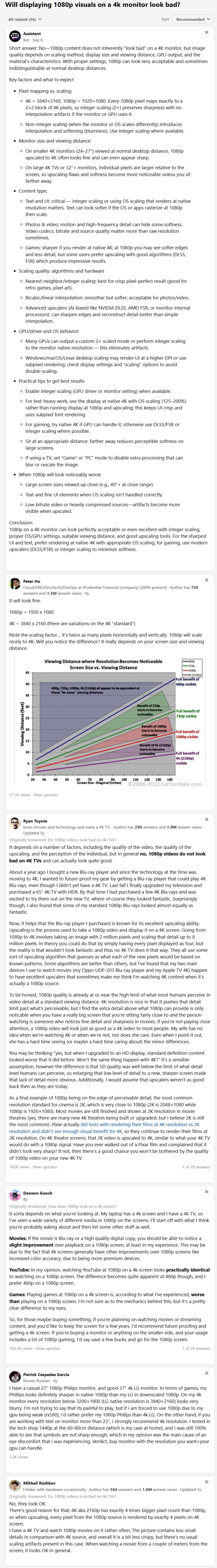 >>108146238(cont'd)I did some research around the web and found many mixed takes and opinions about how well it would work:>Some say it will look like shit>Others say 1080p content on a native 4k screen looks no worse than on a native 1080p screen, because 4K has exactly 4x the amount of pixels and 2x resolution on horizontal and vertical axis, so integer scaling can be used. It's not the same as upscaling a 720p source to native 1080p where complex algorithms and anti-aliasing filtering must be used.>Others say it depends on the model of the 4k monitor/TV, 1080p looks fine on some, it might look like shit on others.>The main issue I noticed is that most answers appear to be speculative, from people without first-hand experience in doing this>Most discussions about the subject over the web in places like Reddit and forums are a trainwreck because lots of functionally illiterate retards assume OP is asking whether 1080p content will look as good as 4K content on a native 4K screen. THAT'S NOT WHAT WE'RE FUCKING ASKING YOU MOUTHBREATHERS we're asking if 1080p content will look as good in a 4K screen, as on a native 1080p screen>Even replies from people with first hand experience appear to focus on movies/game content, not desktop use (font rendering, web browsing, etc) which is my main concern