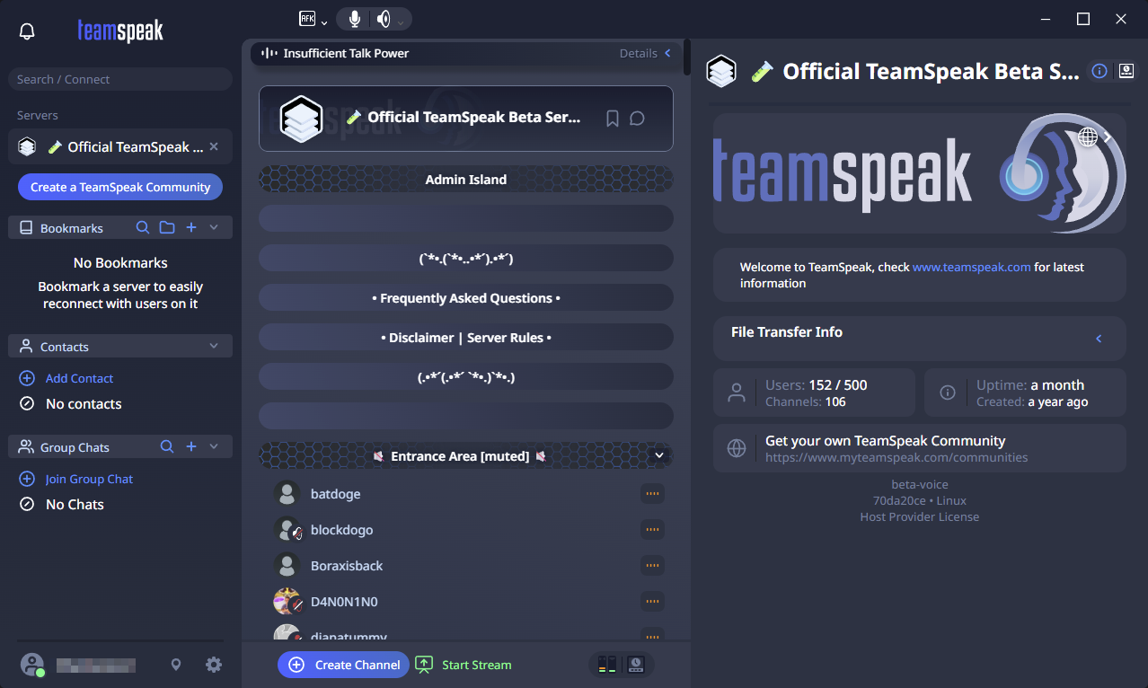 >>108157709I've been running a TS3 server for over a decade I think, for myself and friends. I wish they got their ass into gear and fully released TS6, ideally without any super retarded slot limit or some such for self-hosting small servers.