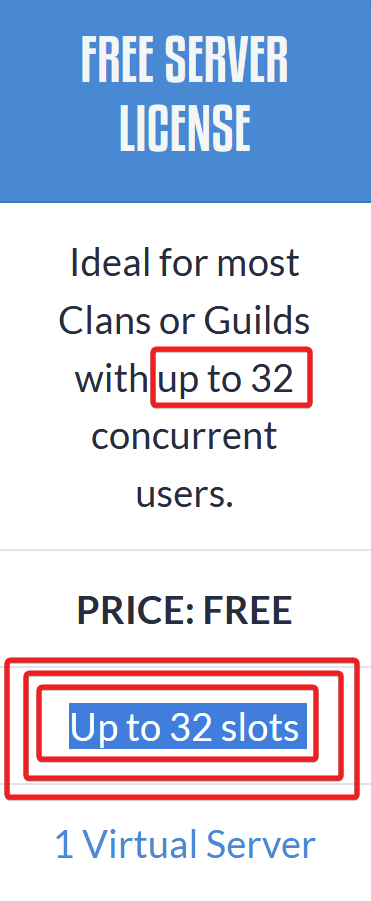 >>108166484He's talking about the limited number of slots per server. Even the page you linked yourself says that free servers allow for 32 slots, in other words you can use it for free and have up to 32 people talking in the server at once, but if you want more than that you need to pay for a license.