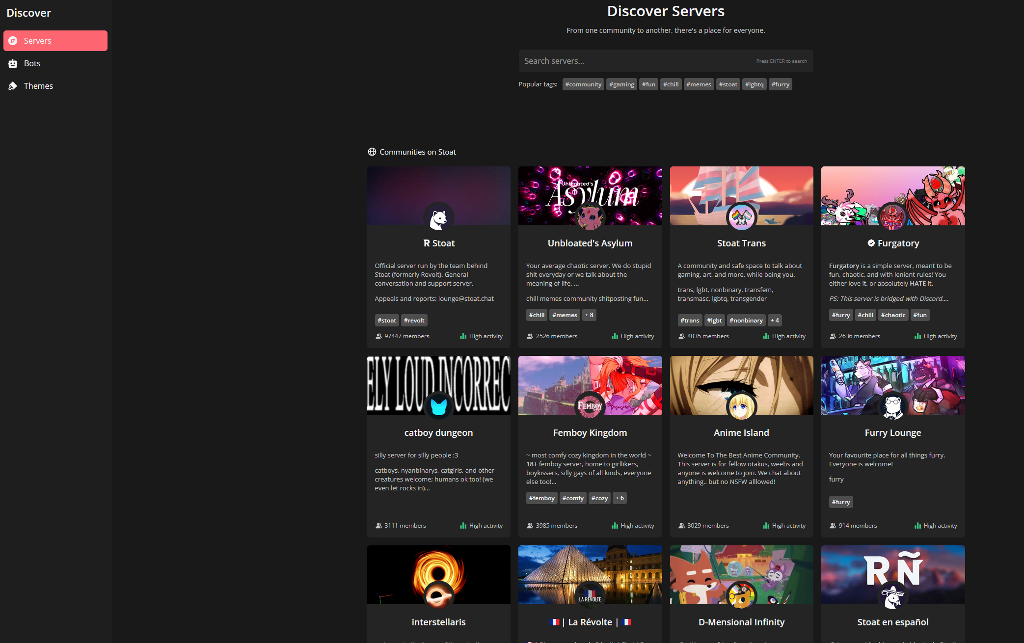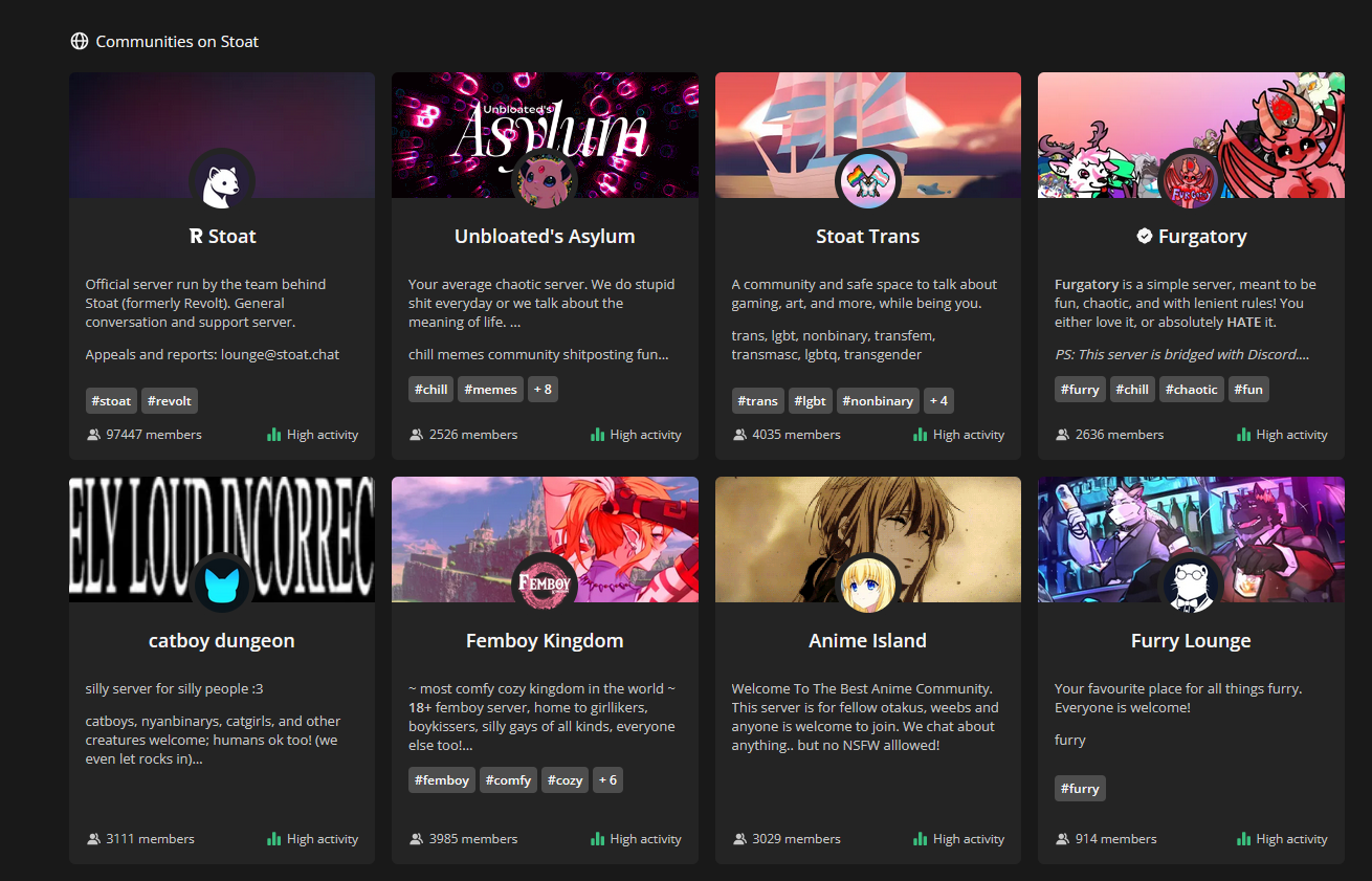 >>108185071The problem is root is yet another discord, who'll sell out at first chance given. Stoat is an actual alternative where privacy might have a chance. Yes, it's been dotting around for a while because it was literally just an idealism project of one guy, but the recent influx developers should at least mitigate. For android they went from literally zero to a small team, revamping the whole app.>>108185194It's a wild bag. UK users get a message for nsfw not being shown due to local laws, but they don't offer any age verification at all. Instead they publicly stated they can't and won't do anything against VPNs.