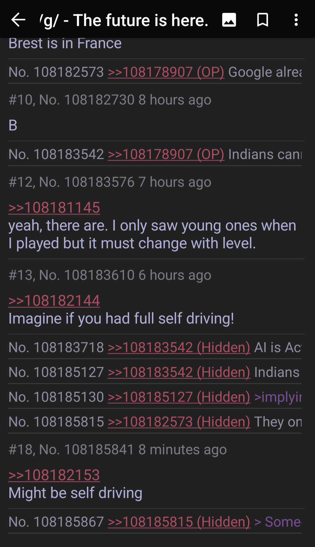 >>108185815> Someone previously droveEven if this were true, Google can't tell a jogger from a bike from a golf cart from a car.But it's not true because I've had Google route me into a brick wall where my destination is at the top of a terrace and the jeetcode thinks the bottom and top are connected.