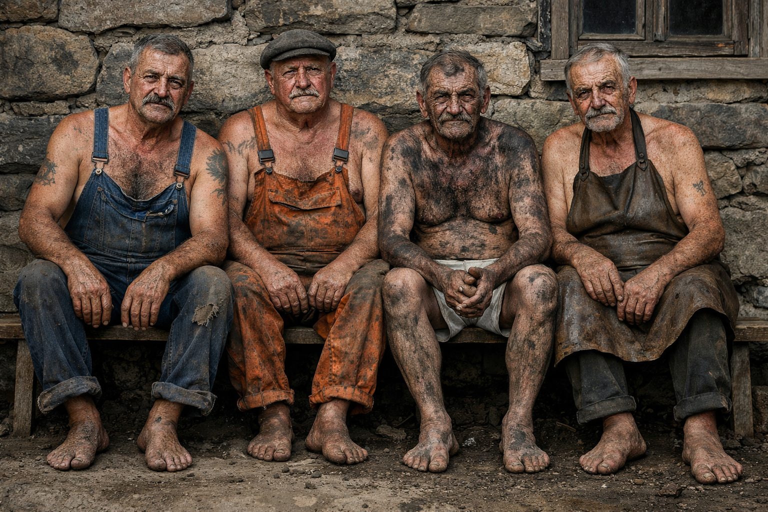 Lumberjack, quarryman, coal miner and potter rest together.