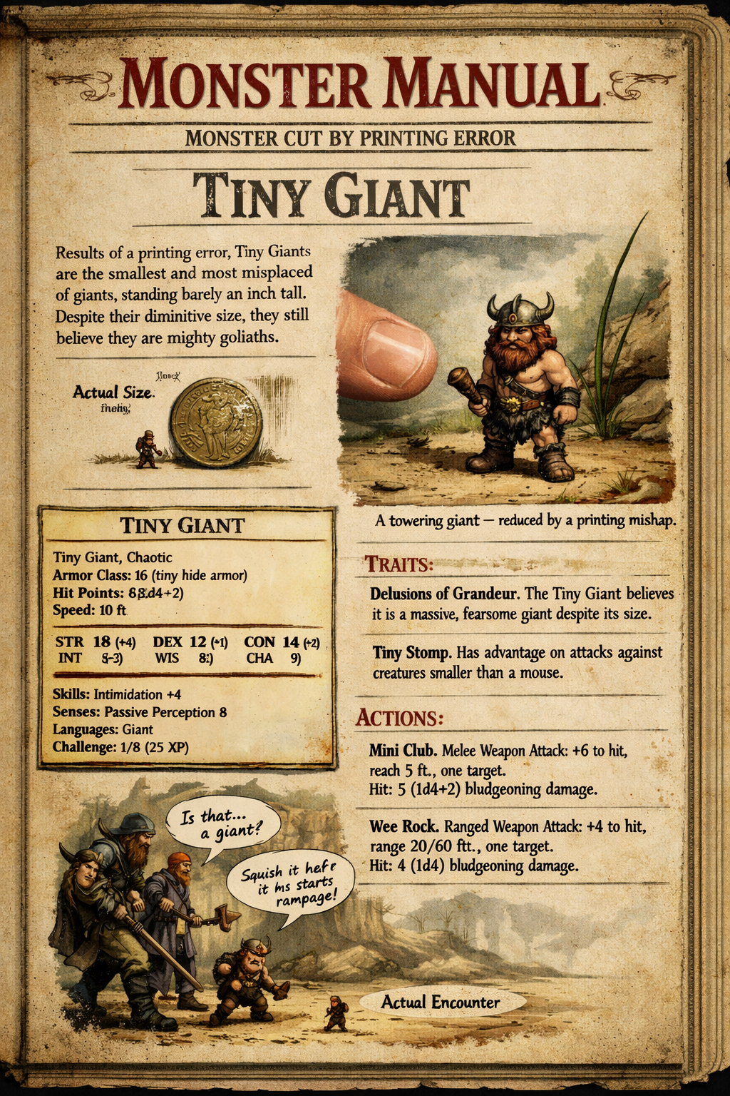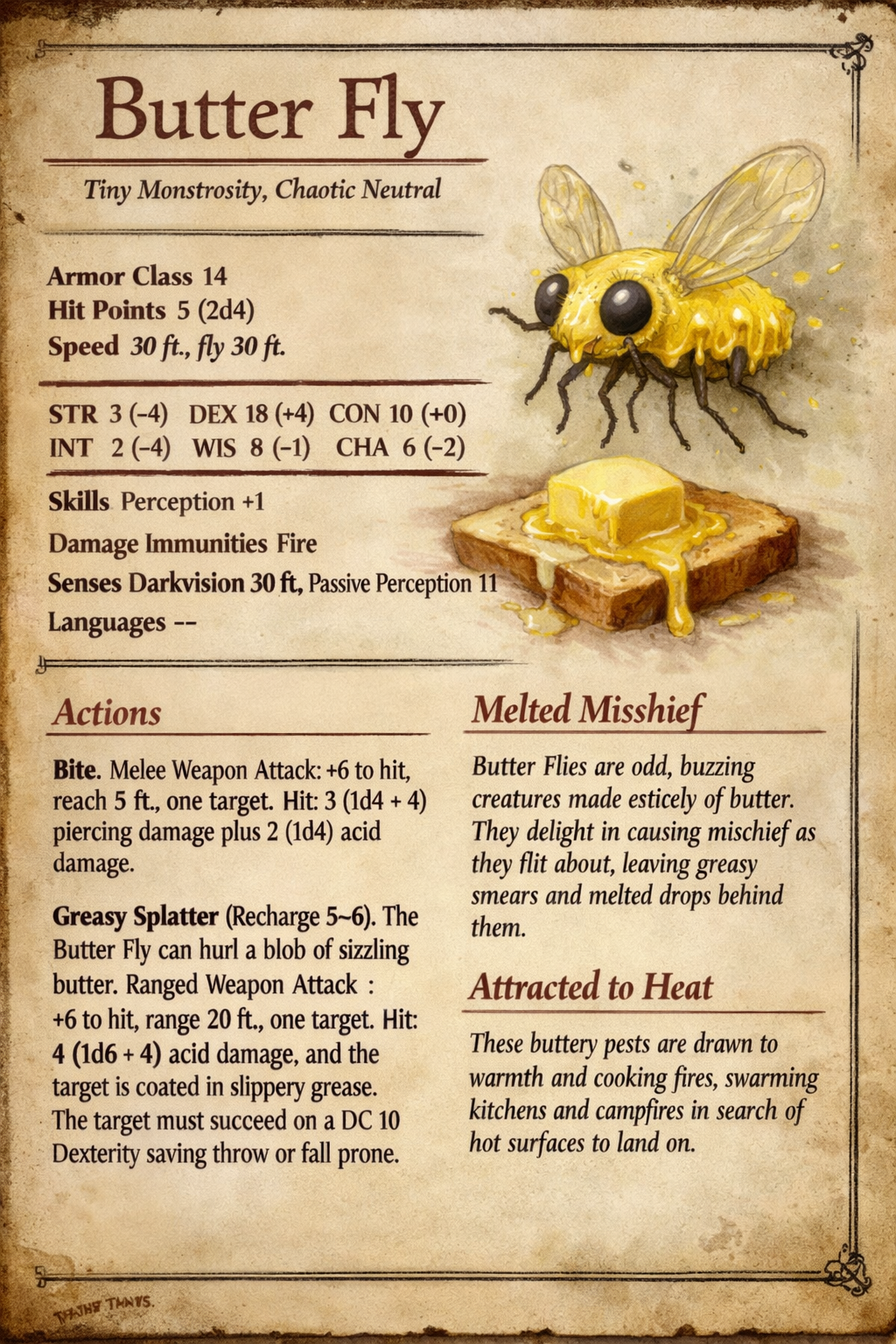 >>108183762I'm afraid you're gonna be disappointed.>page from Monster Manual depicting a "butter fly", tiny monstrosity made of butter and flying like a fly.>page from Monster Manual depicting a "Monster Cut By Printing Error", tiny giant