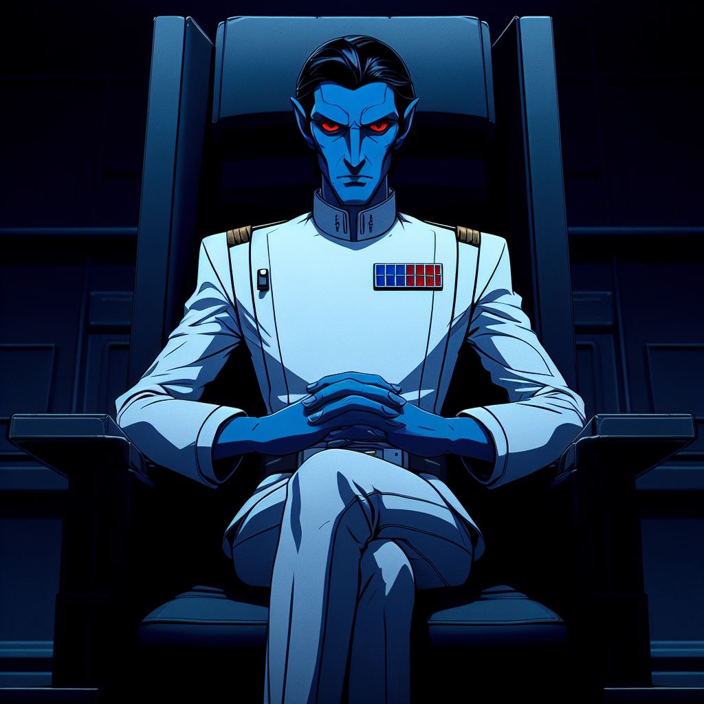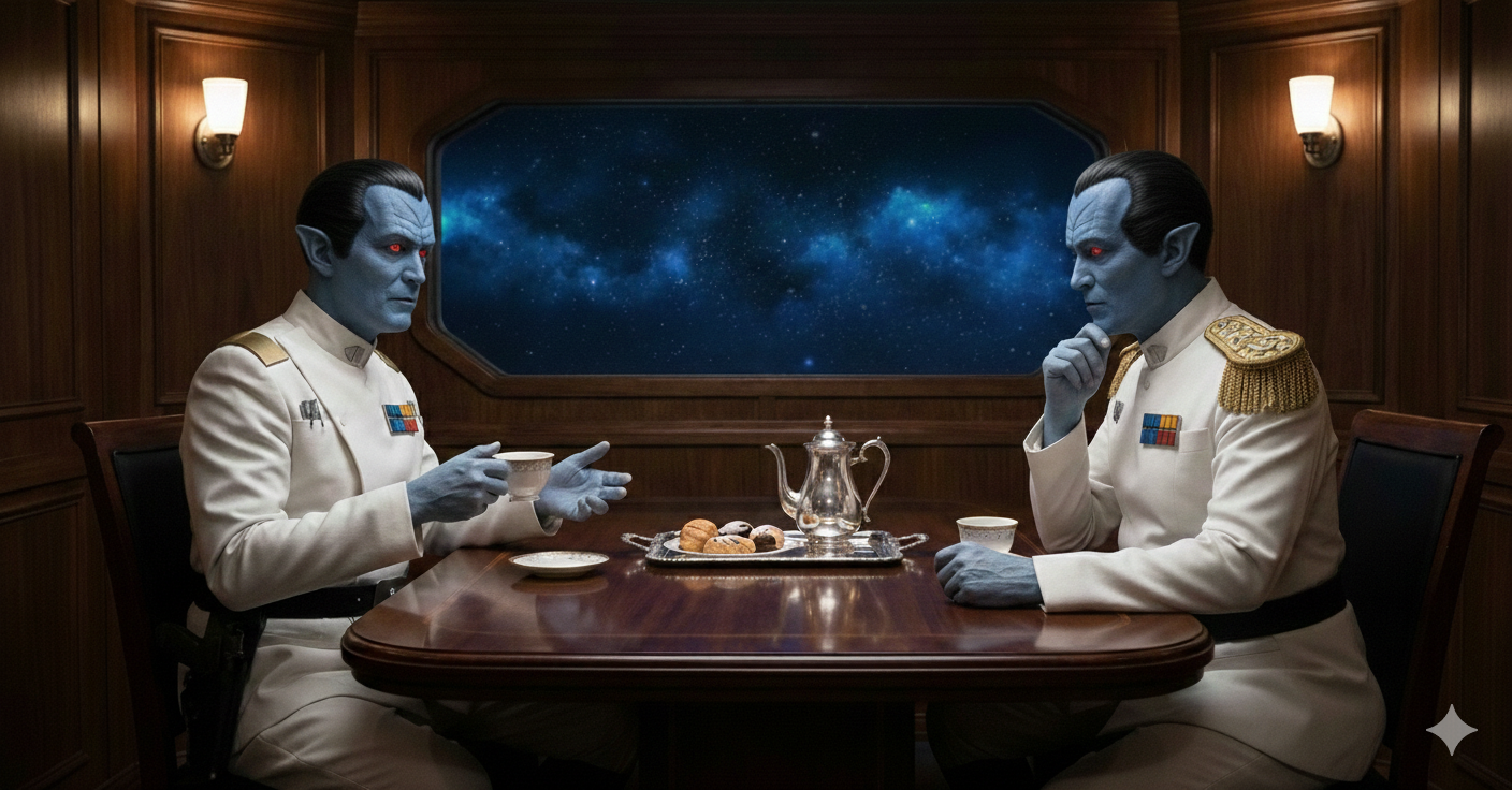 Tried to gen Canon!Thrawn and Legends!Thrawn having tea. It kept ignoring my instructions to give Legends!Thrawn darker skin and a smooth forehead, and I don't know how to get rid of the pointy ears. At least the forehead shape on Canon!Thrawn is good enough.
