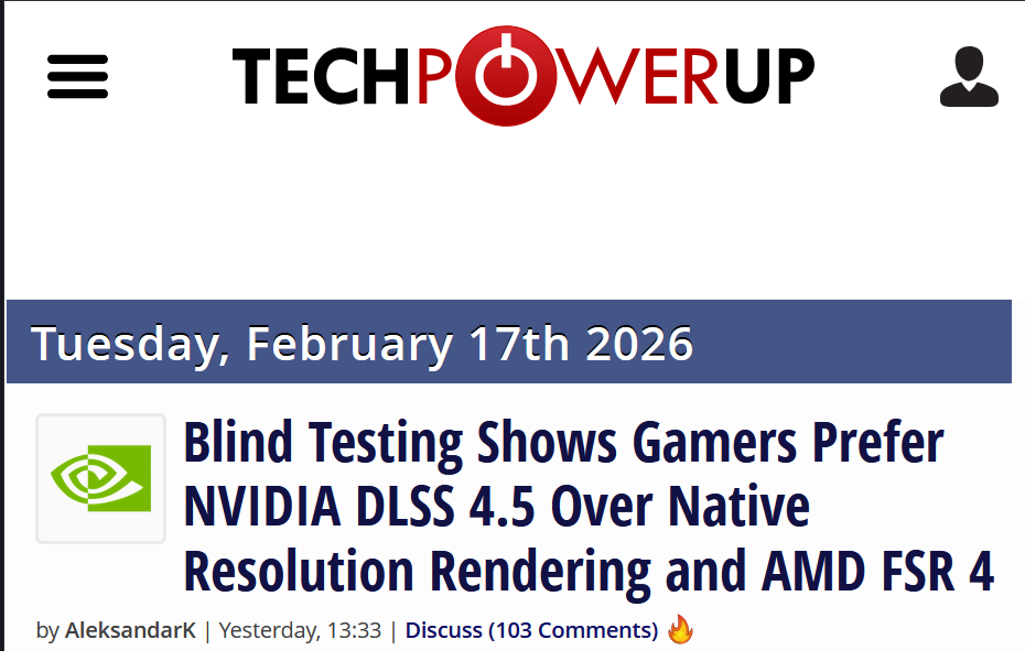 https://www.tomshardware.com/pc-components/gpus/nearly-half-of-pc-gamers-prefer-dlss-4-5-over-amds-fsr-and-even-native-rendering-nvidia-scores-clean-sweep-in-blind-test-of-six-titlestoms hardware replicated hardware unboxed/digital foundry findings but hey its further confirmation that dlss 4.5 doesnt bad