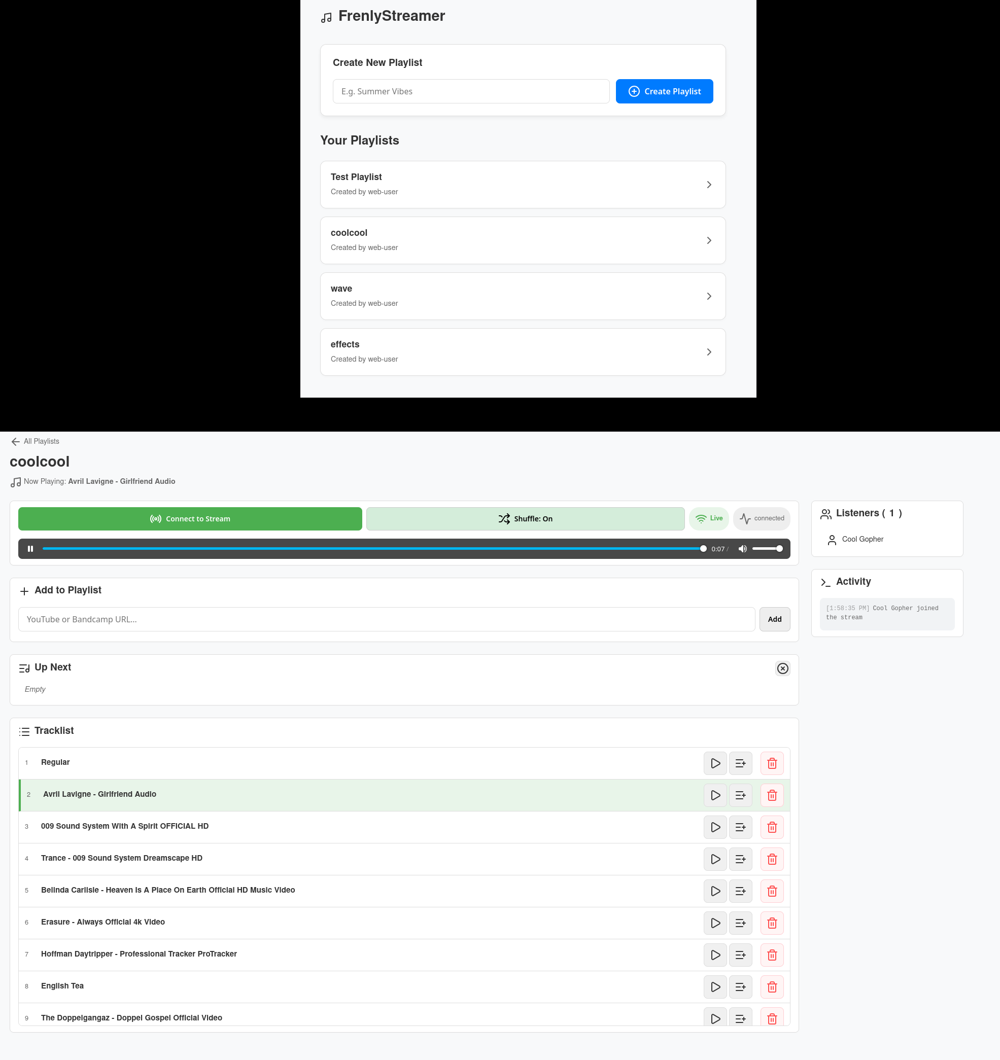 I have vibe coded a neat app to listen to music with frens. You can create playlists, add youtube and bandcamp links, they get downloaded with yt-dlp and added to the playlist.
