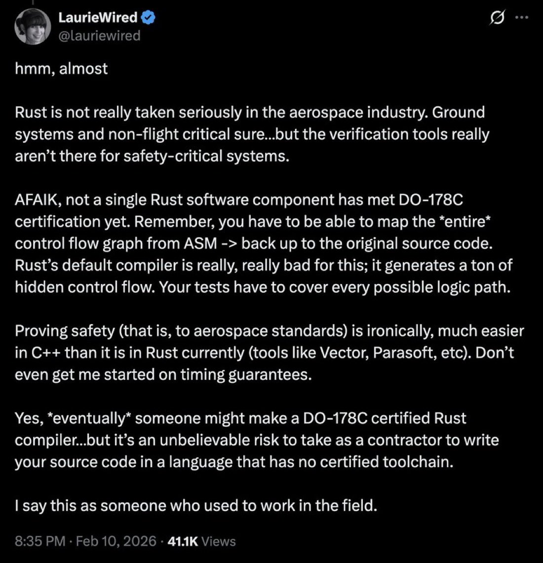 >>108195600I wouldn't be surprised to see at least some attempts to get Ferrocene certified for aerospace. They're currently reporting ISO 26262 (ASIL D), IEC 61508 (SIL 4), and IEC62304 compliance.